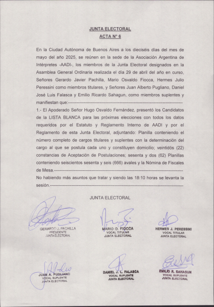 En la Ciudad Autónoma de Buenos Aires a los dieciséis días del mes de mayo del año 2025, se reúnen en la sede de la Asociación Argentina de Intérpretes -AADI-, los miembros de la Junta Electoral designados en la Asamblea General Ordinaria realizada el día 29 de abril del año en curso, Señores Gerardo Javier Pachilla, Mario Osvaldo Fiocca, Hermes Julio Peressini como miembros titulares, y Señores Juan Alberto Pugliano, Daniel José Luis Falasca y Emilio Ricardo Sahagun, como miembros suplentes y manifiestan que: